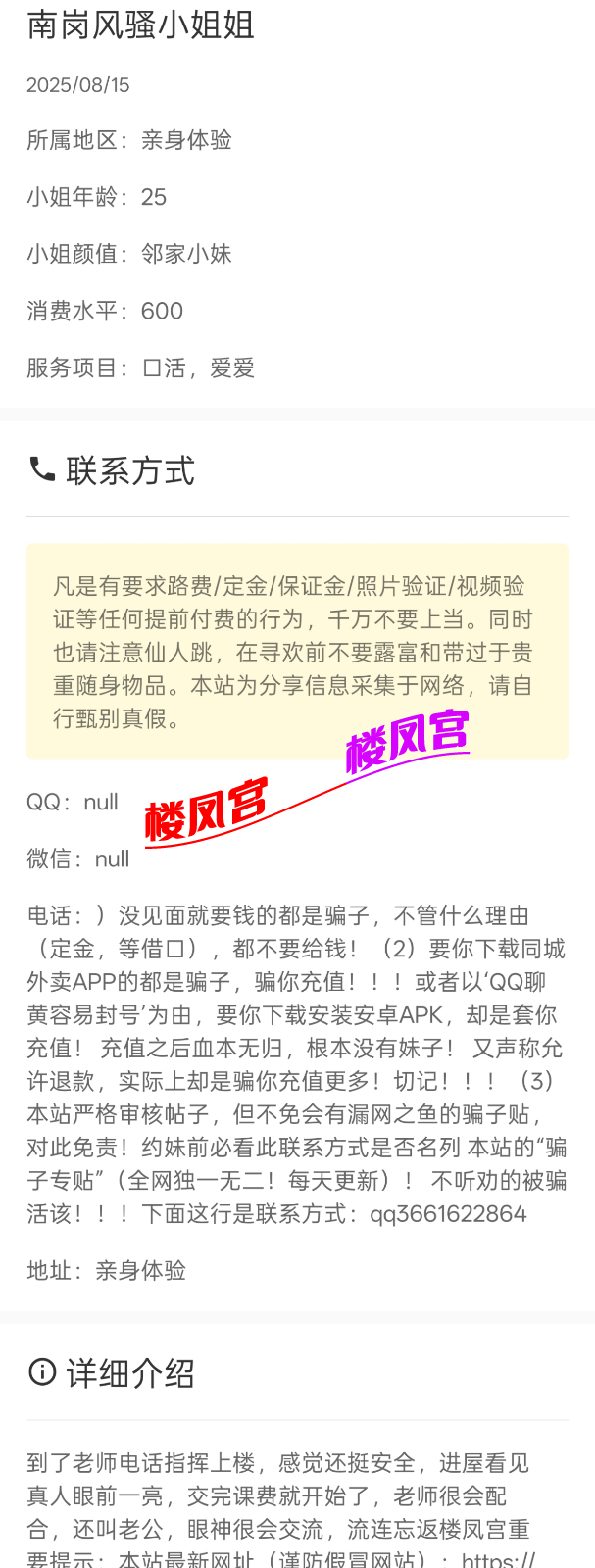 楼凤宫紧急通知:最近冒出许多假APP,宣称美女同城外卖,却是骗充值! 或者以‘QQ聊黄容易封号’为由,要你下载安装安卓APK,却是套你充值! 充值之后血本无归,根本没有妹子! 死骗子们又声称让你再次充值就可以退款前一次的充值,实际上却是骗你充值更多!约妹前必看此联系方式是否名列 本站的“骗子专贴”(全网独一无二!每天更新)!